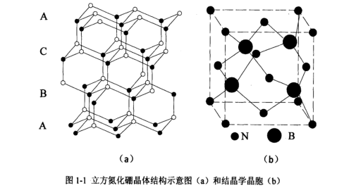 立方氮化硼是閃鋅礦結(jié)構(gòu),屬于立方晶系,沿C軸方向,它的原子層按ACBACB?方式排列,如圖1.1(a)所示。在立方氮化硼中,由一套B原子面心立方結(jié)構(gòu)和一套N原予面心立方結(jié)構(gòu)沿體對角線錯(cuò)開1/4的距離構(gòu)成(如圖1.1(b)所示):氮和硼原子都形成sp3雜化軌道,氮原子雜化后,其中一個(gè)sp3雜化軌道的電子是成對電子,硼原子雜化后,有一個(gè)“軌道”上無電子,稱空位;氮的成對電子進(jìn)入硼的空位,形成了由氮原子單方貢獻(xiàn)一對電子的N_B配位鍵。