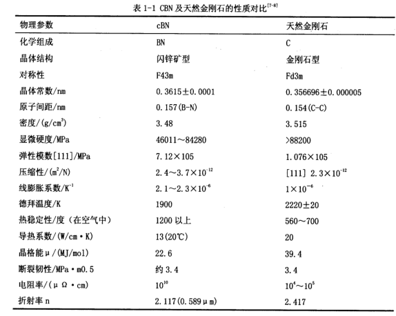 CBN與金剛石在性能上有很多相似之處(見表1一1),與金剛石相比,CBN的硬度和導(dǎo)熱系數(shù)較低,一方面是因?yàn)锽-N之間的結(jié)合具有離子性(約22%);另一方面是由于該離子熱激發(fā)時(shí)產(chǎn)生稍微大的晶格自由度,提高了CBN向六方氮化硼逆轉(zhuǎn)變所需的溫度,使CBN顯示出比金剛石高的耐熱性和大的沖擊熱阻。