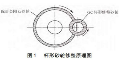 金剛石砂輪修整方法是影響砂輪磨削性能的重要因素,修整方法的合理選擇將直接影響工件的表面質(zhì)量和磨削精度。目前常用的金剛石砂輪修整方法有: 在線電解修整、電火花砂輪修整、杯形砂輪修整、電解—機械復合修整和激光修整。由于杯形砂輪修整方法較其他修整方法操作簡單易于實現(xiàn),因此本文采用 GC 杯形砂輪修整技術(shù)對金剛石砂輪進行自動修整。