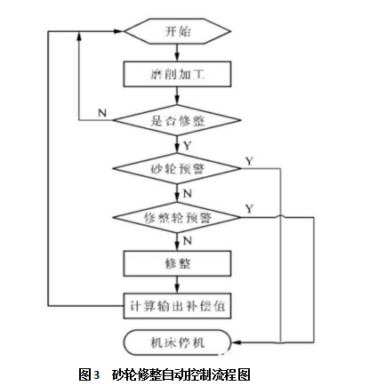 在磨削加工中,砂輪的磨損狀態(tài)是影響磨削質(zhì)量的一個重要因素。該數(shù)控工具磨床可在刀片加工磨削的全過程中對砂輪狀態(tài)進行實時監(jiān)測。根據(jù)加工刀片尺寸和材料的不同,需要磨削去除的體積和磨削時間也不同。綜合考慮各個因素,設(shè)定自動修整的間隔。通過對砂輪磨削刀片次數(shù)計數(shù),并實時的將其與系統(tǒng)設(shè)定的修整間隔比較。當磨削次數(shù)達到設(shè)定的修整間隔次數(shù)時,在 NC 程序中自動調(diào)用修整模塊,實現(xiàn)砂輪的自動修整。為了保證機床運行安全,該控制方法還加入了對砂輪壽命和修整輪壽命的實時監(jiān)控。只要檢測到本次修整將可能導致砂輪或修整輪到達預警厚度,機床將自動發(fā)出報警信號,停機等待人工處理。如果砂輪和修整輪均未到達報警厚度,則修整順利進行。修整結(jié)束后,通過數(shù)據(jù)處理,輸出砂輪修整后的補償值。砂輪修整自動控制流程如圖 3 所示