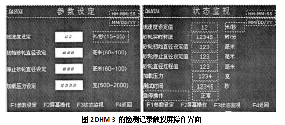 圖2是DHM-3的柱測記錄觸摸屏操作界面。通過該界面可以錕方便地蔣需要的工作參數錄^;通過狀態(tài)監(jiān)視界面可以實時地觀測、查詢檢測數據。