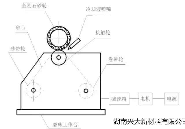 軟彈性修整法在修整時(shí)砂帶套在砂帶輪上,修整時(shí)金剛石砂輪高速旋轉(zhuǎn),卷帶輪緩慢轉(zhuǎn)動(dòng),砂帶在帶輪上慢慢移動(dòng),利用砂帶與砂輪的接觸力有效地去除金剛石砂輪表面磨粒間的結(jié)合劑,從而達(dá)到修整的目的。