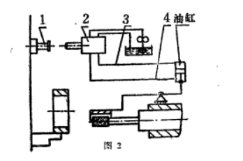 圖2是內(nèi)圓磨砂輪主軸可在砂輪進入工件內(nèi)孔進行磨削時防護罩自動抬起,在砂輪退出后防護罩自動下落將砂輪罩住的液壓系統(tǒng)控制的防護罩示意圖:液壓開關(guān)2與砂輪架一起向左運動,碰塊1頂開液壓開關(guān)2壓力油自油路3進入油缸上方,油路4與回油路接通,砂輪防護罩抬起,砂輪罩向右運動,液壓開關(guān)2離開碰塊1壓力油從路4進入油缸下部,砂輪罩將砂輪罩住。